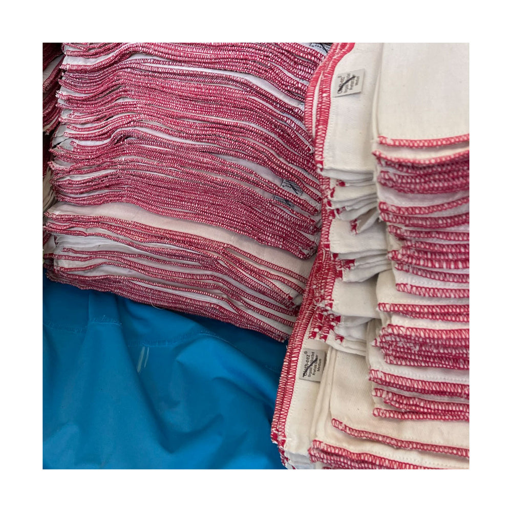 Larger rags - can be Intermediate, Medium, Large or XL prefolds. Usually a combination. Approximately 14 to 19 inches long, layering varies either 4-6-4 ply or 4-8-4 ply. OCTOBER 2025 stock is only MEDIUM.